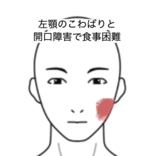 半年くらい前から下の歯あたりの圧迫感と顎のラインの痛みがある。自覚はなかったが、歯科医で食いしばりがあることを指摘されたため、マウスピースを着用することもある。マウスピースを着けている間は圧迫感が軽減する。顎のラインは、何もしていなくても腫れている感覚があり、触るとよりハッキリそれが分かる。