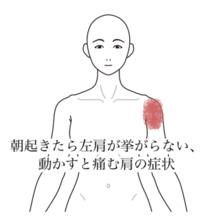 まずは肩・臀部に関連する背中のツボに鍼をした。肩の可動域を確認すると可動域が高まり後ろまで引いたところで痛むとのこと。次に背中のツボに鍼をした。確認したところ肩・臀部の痛みが同時に取れた。