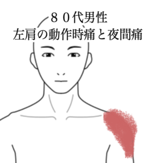 3日前に転倒による手関節の打撲があり、その翌日(2日前)に寝違えが重なったことで、左肩に強い痛みが出現した。動作時に左肩の奥に痛みを感じ、特に挙上動作で顕著であった。静止時や夜間の痛みはないものの、衣服の着脱に支障をきたすほどの可動域制限があった。当初は手首から腕にかけても痛みと違和感が広がっていた。