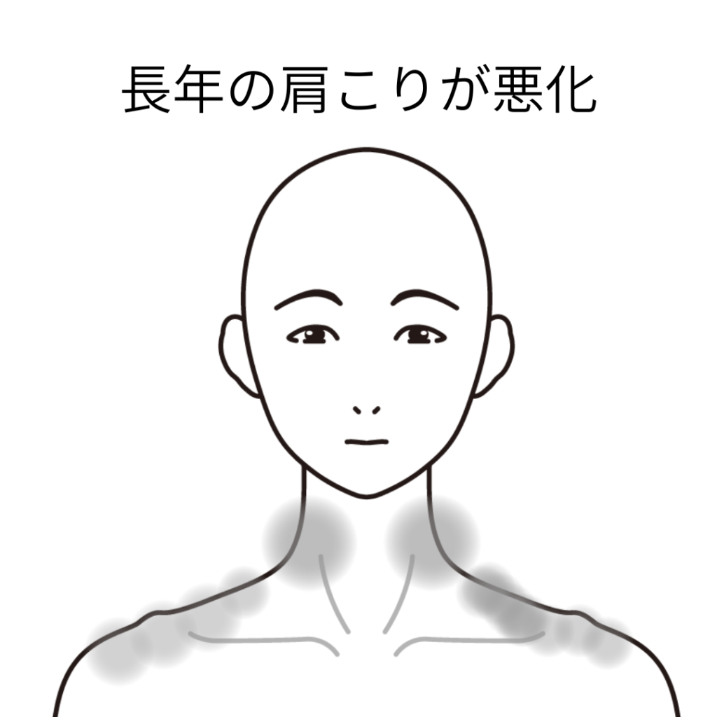両肩全体に強い張りを感じ、時には痛みを伴う状態が続いていた。また、強いもみほぐしを受けると、症状が悪化する傾向があった。