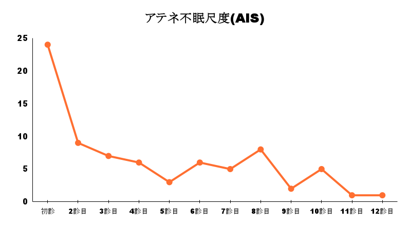 初診時のアテネ不眠尺度(AIS)は24点(最高値24点、最低値0点)を示し、重度の不眠状態にあった。
